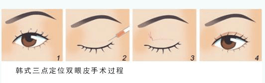 韩式三点法:在上眼睑皮肤的合适位置,轻柔地制作三个长度仅有2—3毫米的不连续的微小伤口,去掉部分脂肪和多余皮肤,并将真皮层与眼睑进行三点缝合。做出的双眼皮线条自然美观,睑缘充分舒展,睫毛自然上翘,且创口更小,消肿更快,效果可永久维持。